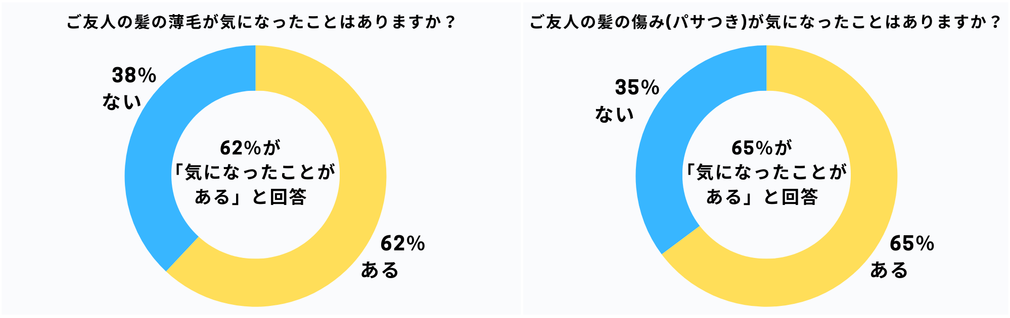 アンケートの結果によると、「ご友人の髪の薄毛が気になったことはありますか?」「ご友人の髪の毛の傷み(パサつき)が気になったことはありますか?」という質問に対し、いずれも6割以上の人が「気になったことがある」と回答。多くの方が、思っている以上に人の髪に注目していることが分かりました。