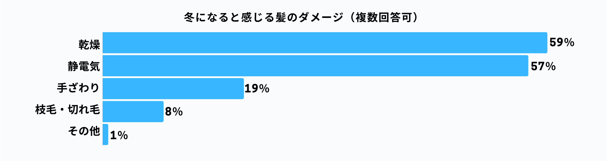 また、「冬になると感じる髪のダメージはありますか?」という質問には、「乾燥」が最も多く、次いで「静電気」があがりました。多くの方が、冬場の乾燥により髪の状態が変化することを実感しているようです。